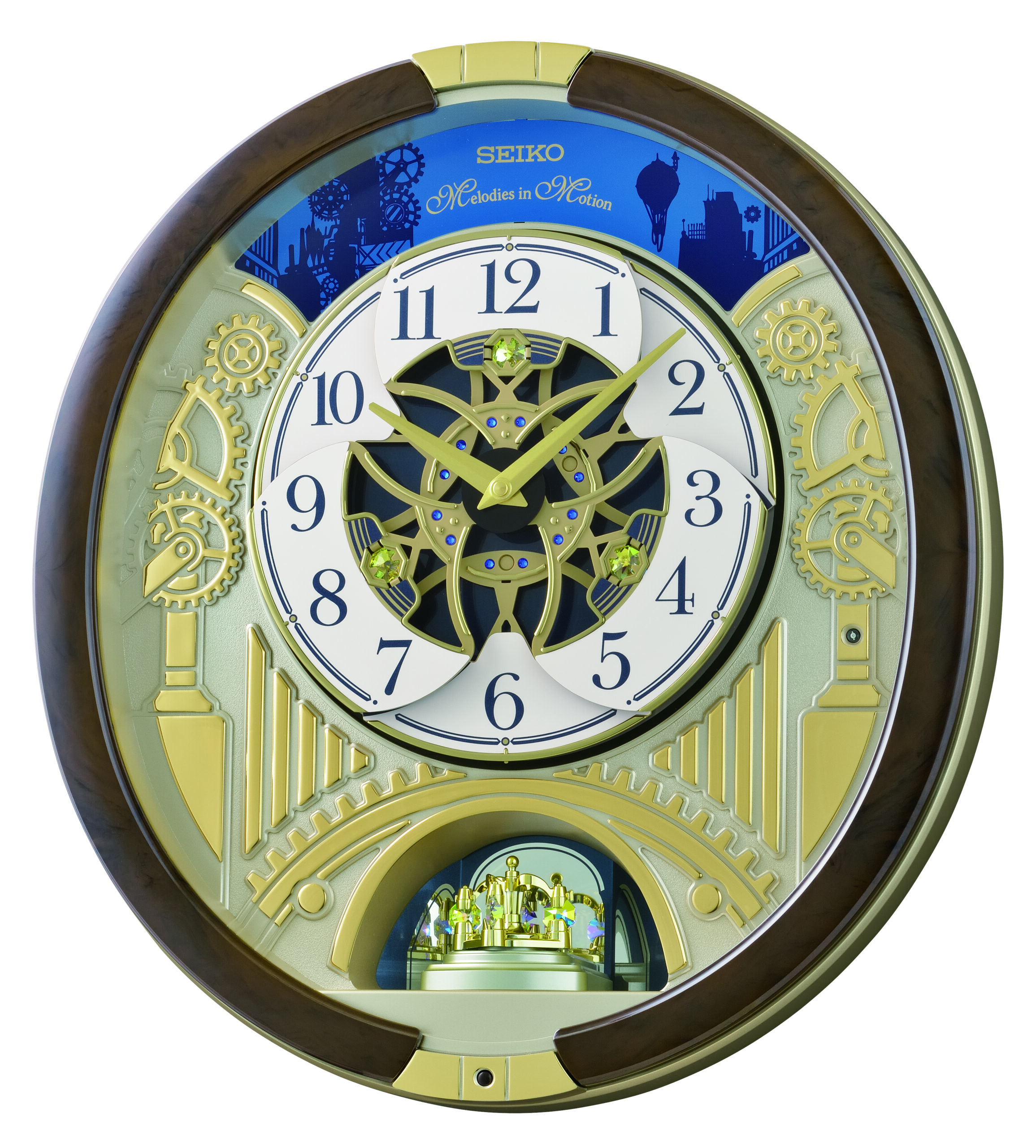 Sold exclusively at Sam’s Club, 2025 Melodies In Motion will evoke years of precious family memories with each song played. This year’s clock is a spectacular showcase of golden pillars and steam punk gears. Melodies In Motion by Seiko is a whimsical musical clock which plays 1 of 45 high-fidelity melodies every hour while the dial on the face opens and spins. This year’s clock is adorned with 19 Preciosa crystals which sparkle and twinkle in the light. The 6-piece dial opoens and turns during hourly melodies. The frame of the clock is a dark brown faux wooden grain design perfectly complimenting any decor. The light sensor ensures that the clock stays quiet in the dark. Enjoy this clock all year long with its 15 classical music box melodies, 10 holiday melodies and 20 all classic crystal bell melodies. The rotating pendulum adds sparkle and shine with each Preciosa Crystal precisely placed for optimum delight. Measuring 17.5 X 16 X 3.8 inches this spectacular wall clock will add beauty to any space. All Seiko clocks are equipped with crystal quartz movement making it the most precise in time keeping. Powered by 4 “C” batteries, included. This clock is perfect for any age to adult.