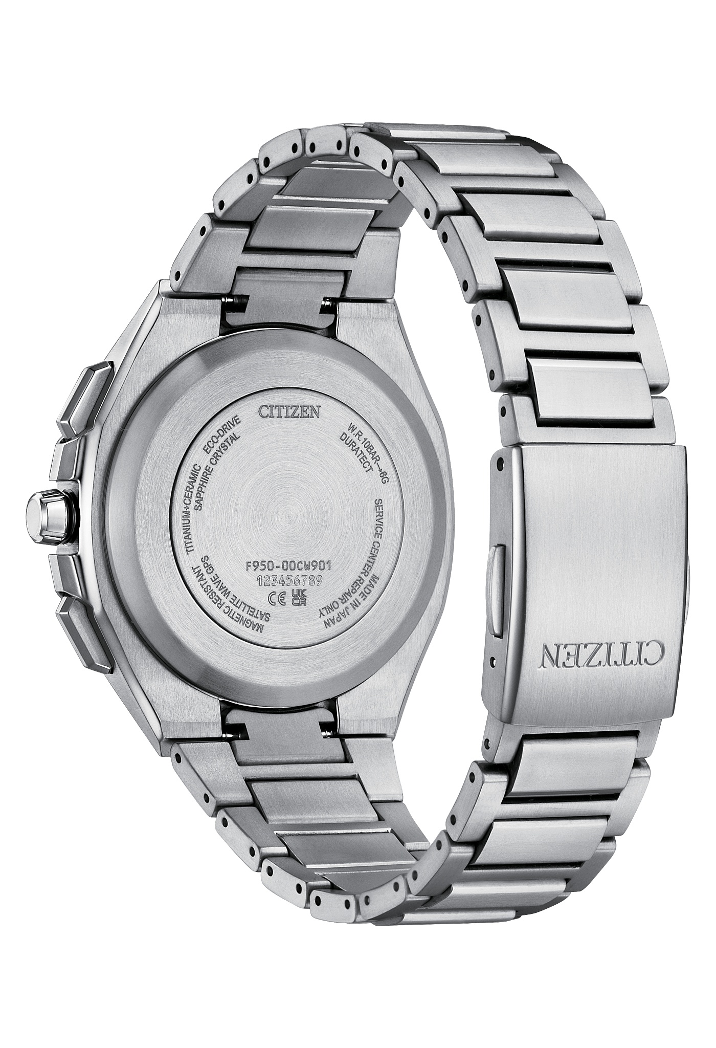 Powerful design and advanced technology drive the new luxury Attesa. Since its 1987 launch, the Attesa has delivered dependable performance via expert titanium-processing know-how and innovative chronograph technology, and the latest addition to the collection is no different. A silver-tone 43.2mm Super Titanium™ case solidifies the lightweight, durable construction of the timepiece that is also scratch- and rust-resistant, while sharp faceting and an integrated, triple-link Super Titanium™ bracelet confirm the futuristic design. A duo of avant-garde style chronograph pushers and crown guards provide sleek and sporty touches. A world time bezel frames the textured gray dial and its three registers, with applied silver-tone accents and a date window between 4 and 5 o’clock, adding dimensionality alongside utility. This model features the most advanced movement for Eco-Drive Satellite Wave GPS watches and delivers the world’s fastest time-only signal reception in as little as 3 seconds. Other advanced features include world time in 27 cities (40 time zones), a 1/20-second chronograph, dual time zones (UTC) universal coordinated time display, a perpetual calendar, as well as daylight savings time, and power reserve and light level indicators. This distinctive chronograph utilizes Citizen’s Eco-Drive technology that’s sustainably powered by any light and never needs a battery. Water resistant up to 100 meters. Caliber F950.