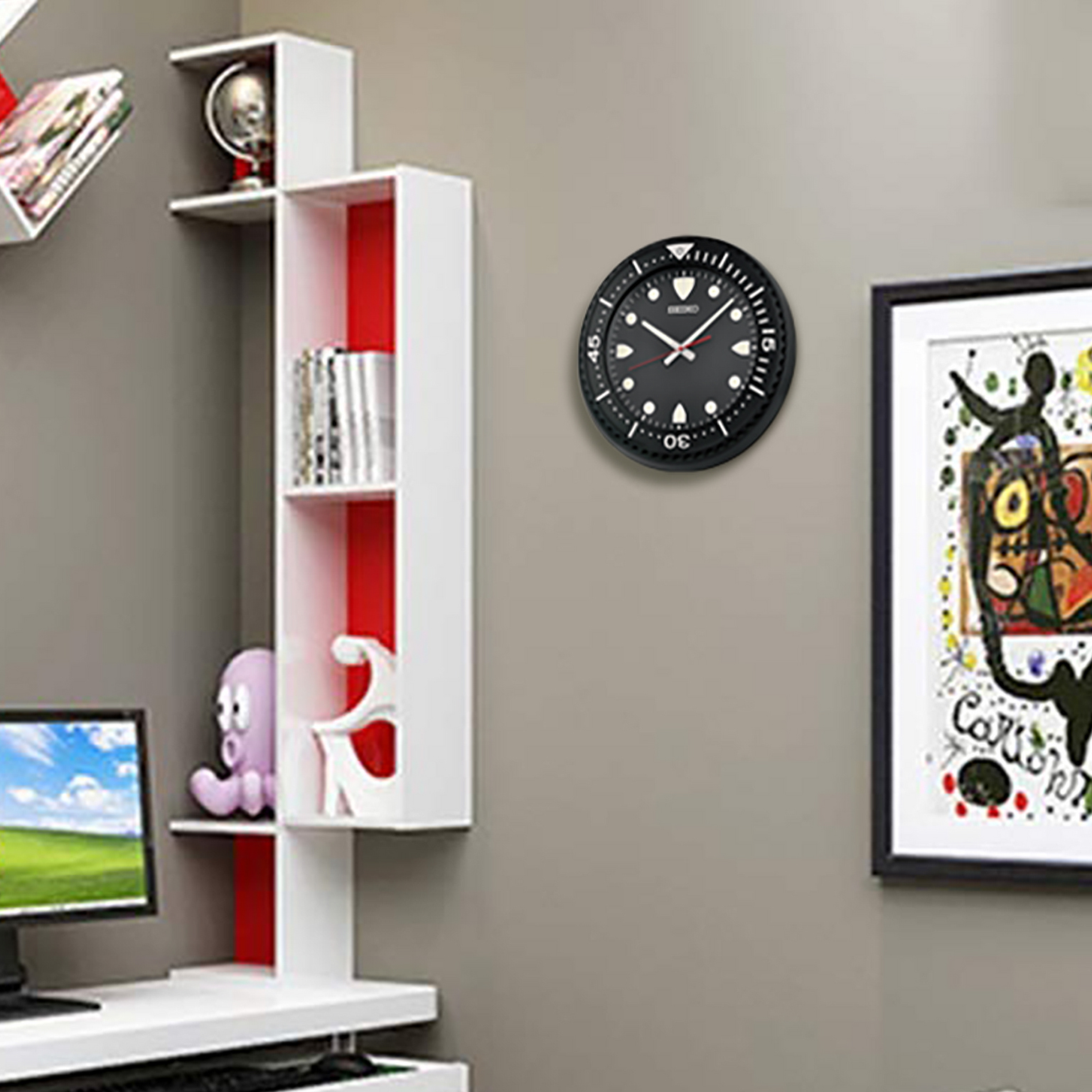 Big Style. Big Personality. Big Time. Make a bold statement with the Seiko Wall Clock where iconic design meets oversized impact. Inspired by the look of popular mens diver watches, this wall clock brings sporty style and serious timekeeping to any room. Choose from blue and red, black, or silver case colors to match your vibe. The aluminum frame features easy-to-read numeral indicators for minutes or seconds, and LumiBrite accents on the hour markers and hands ensure visibility even in the dark. With a quiet sweep second hand that glides smoothly (no ticking here.), its perfect for bedrooms, home offices, game rooms, or any spot where silence is golden. Whether you are young, grown up, or somewhere in between, this clock brings a fun and functional twist to wall décor. Features You will Love: Sporty, oversized design like a diver watch for your wall. Available in blue/red, black, or silver, aluminum frame with minute/second indicators, LumiBrite hands and hour markers glow in the dark, quiet sweep second hand no ticking distractions, powered by 1 AA battery (included). Quartz crystal movement for top notch accuracy, big and bold at 18 x 18 x 3.5 inches. Perfect for tweens to adults, the Seiko Big Time Wall Clock is more than just a timepiece its a conversation starter, a room-enhancer, and a reminder that time should always look this good.