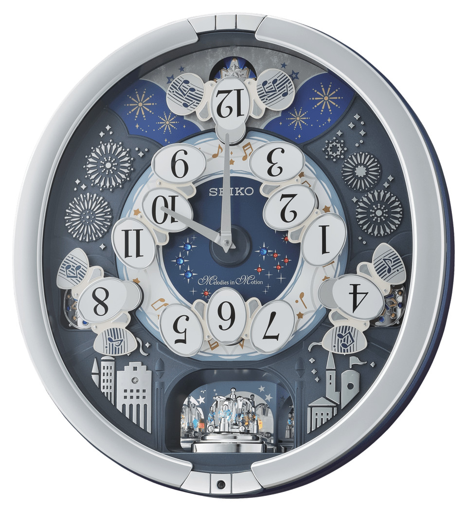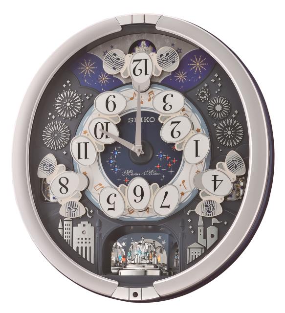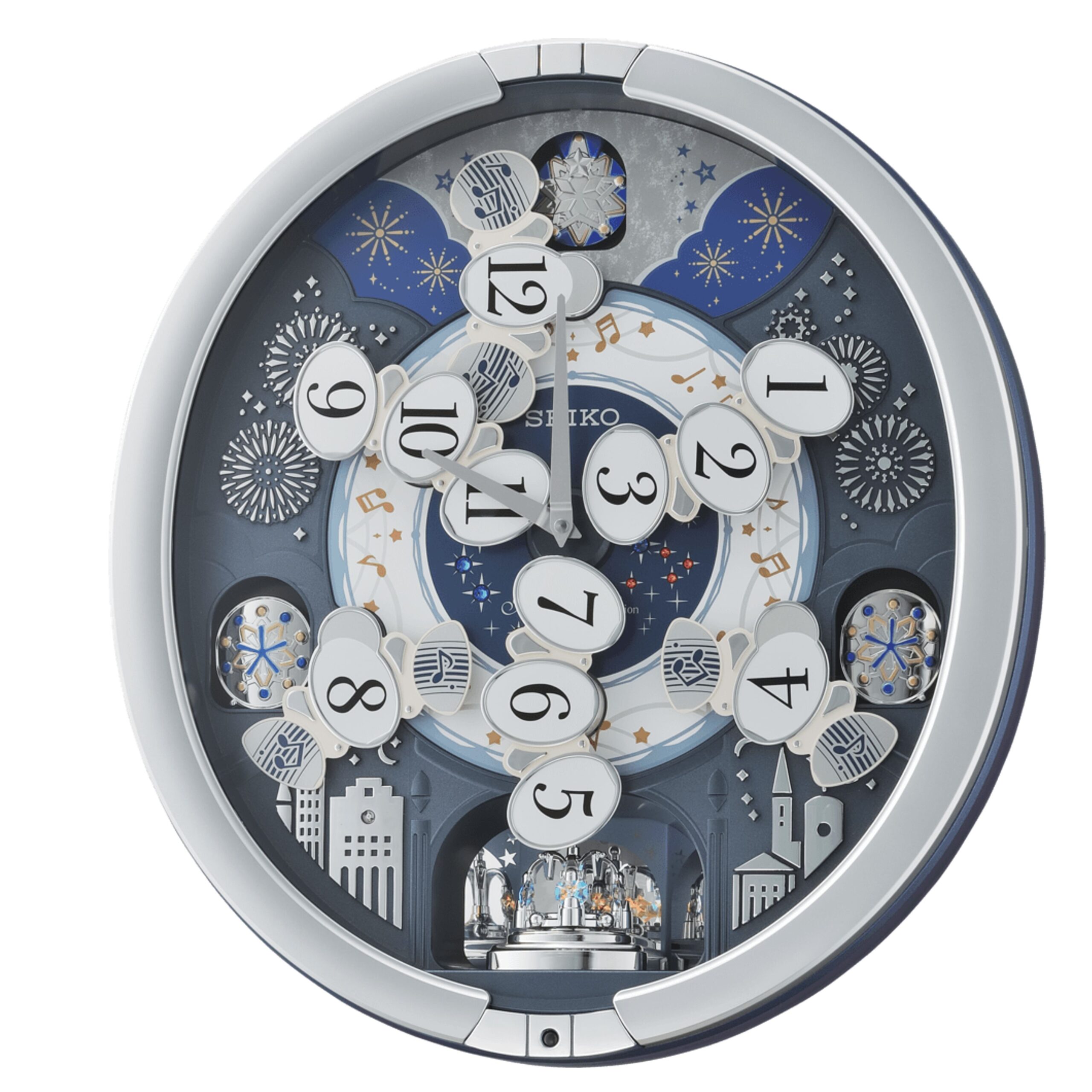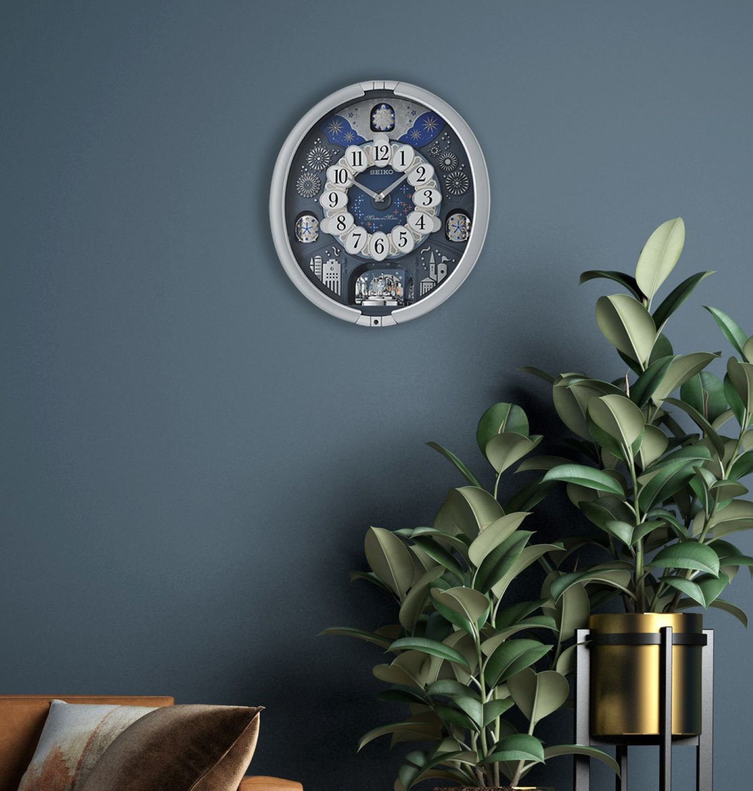 Seiko’s Melodies in Motion Clocks are enchanting and magical. This clock brings a glittering starry night to life. On the hour, the dial opens to reveal a turning decorative wheel with Swarovski crystals and plays one of eighteen of the finest quality sound melodies or Westminster chime. It has a metallic silver case, a demonstration button, and volume control. This clock is enclosed in glass, the pendulum features Swarovski crystals, and an off/on switch. This clock will light up your house year-round.