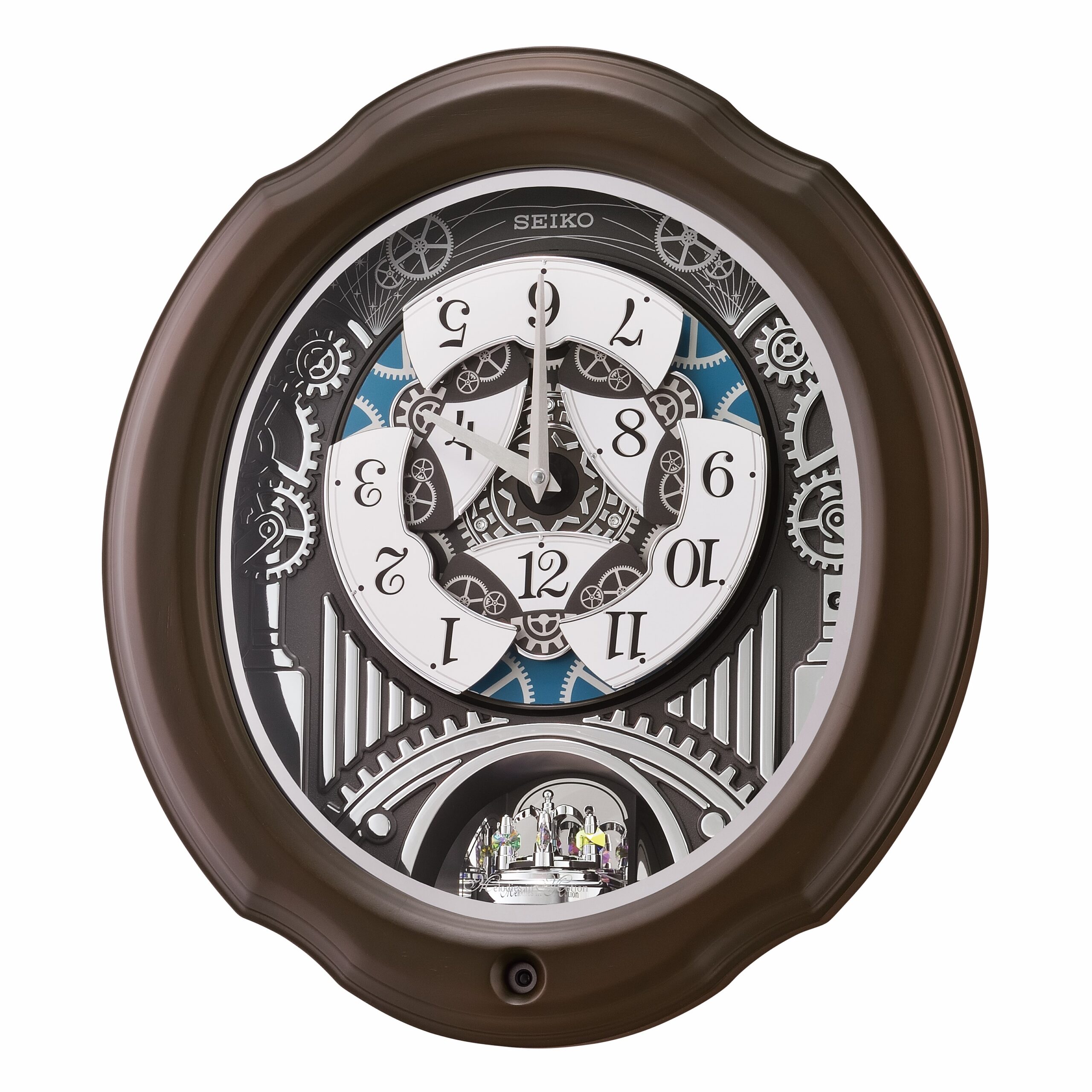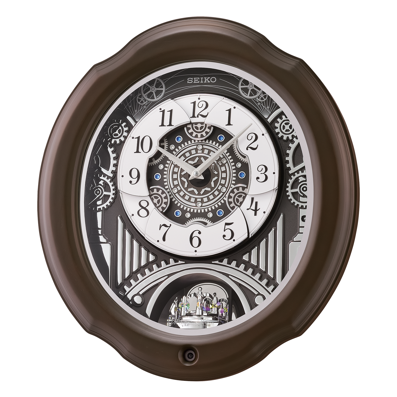 Seiko’s Melodies in Motion Clocks are enchanting and magical. This clock highlights silver colored gears. On the hour, the dial opens to reveal a turning decorative wheel and plays one of thirty-six of the finest quality sound melodies plus an opening and ending melody. It has a mahogany brown color case, a demonstration button, and volume control. This clock is enclosed in glass, the pendulum features colorful crystals, and an off/on switch. This clock will light up your house year-round. Powered by 4 “C” batteries. Overall dimensions 19 x 17.1 x 4.3 inches. Quartz crystal movement allows for the most accurate time keeping. Perfect for all ages.