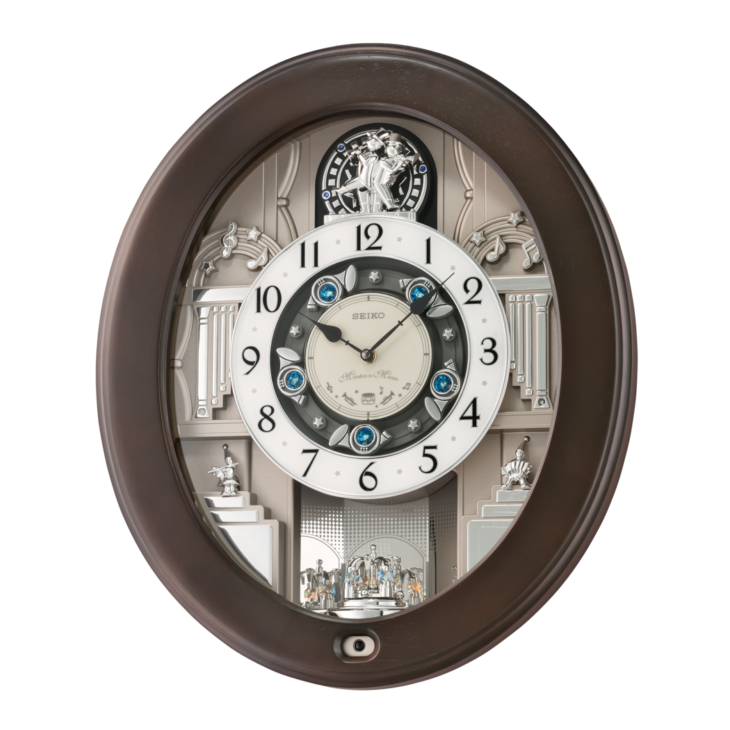 Seiko’s Melodies in Motion Clocks are enchanting and magical. This clock highlights everything we love about music. On the hour, the dial opens and turns, and plays one of thirty of the finest quality sound melodies . It has rich brown case with blue accents, a demonstration button, and volume control. This clock is enclosed in glass and has an off/on switch. This clock will light up your house year-round. Measuring 19.1 X 16.1 X 4.7 inches this spectacular wall clock will add beauty to any space. All Seiko clocks are equipped with crystal quartz movement making it the most precise in time keeping. Powered by 4 “C” batteries, included. This clock is perfect for any age to adult.
