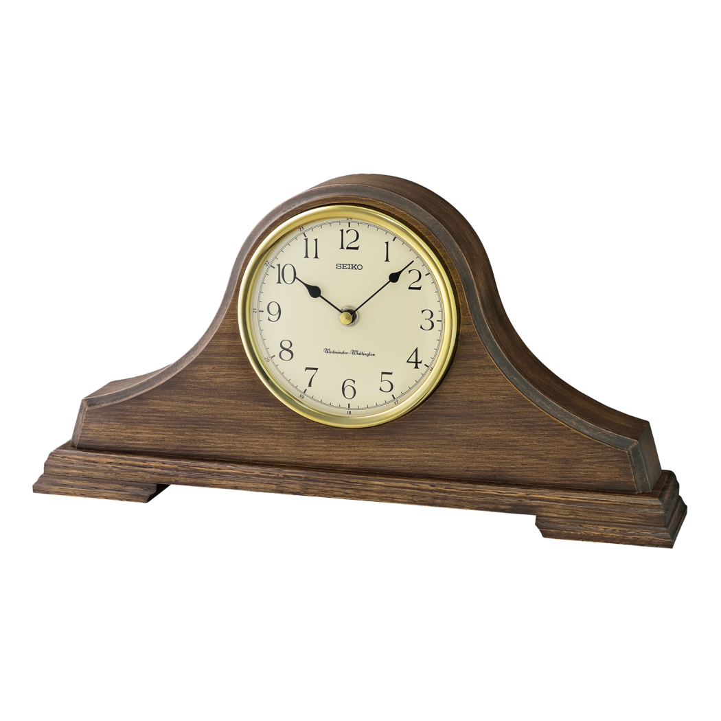 Quartz movement curve appeal is achieved in this display clock! The Seiko Mantel Clock is crafted with rich brown oak and the rounded tambour case adds traditional luxury to any decor. Selectable Westminster or Whittington chimes with quarter hour chime and hourly strikes. A feature simply powered and maintained with an easy battery change. This wall clock is equipped with a volume control and a nighttime chime silencer.