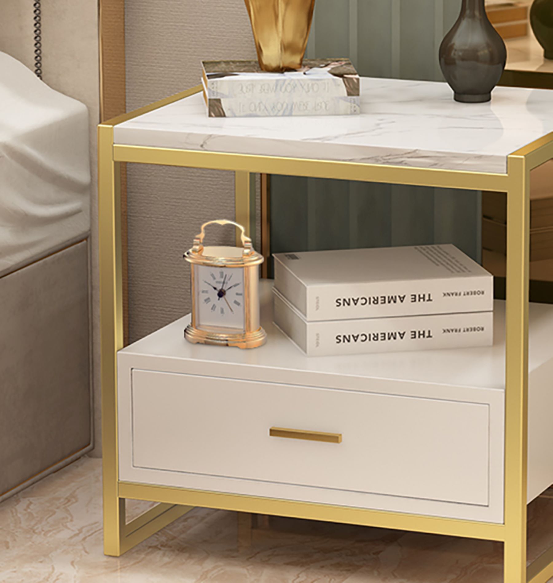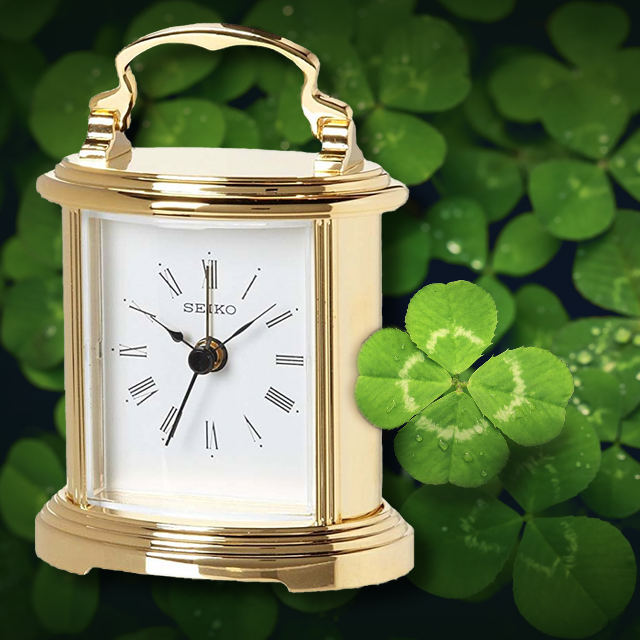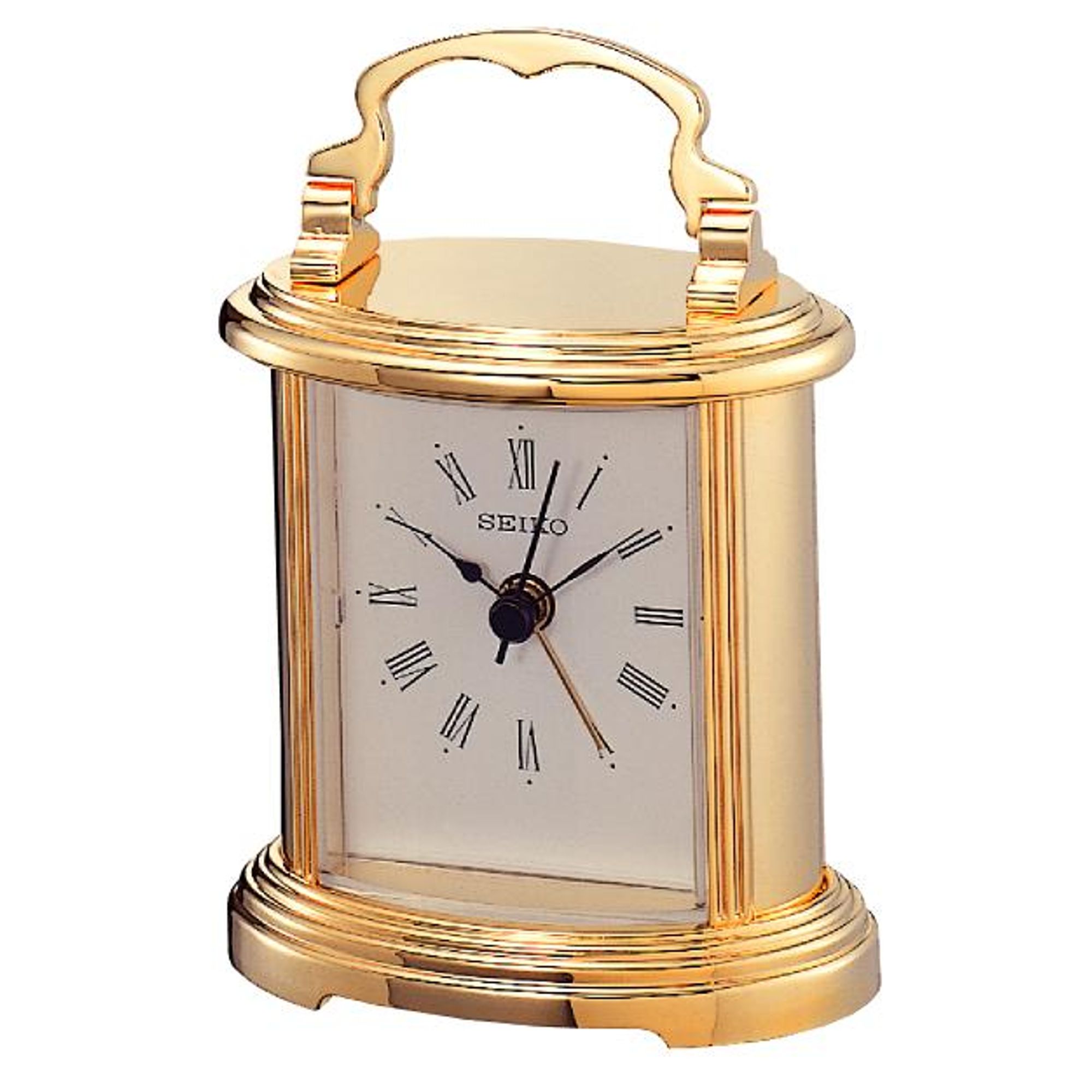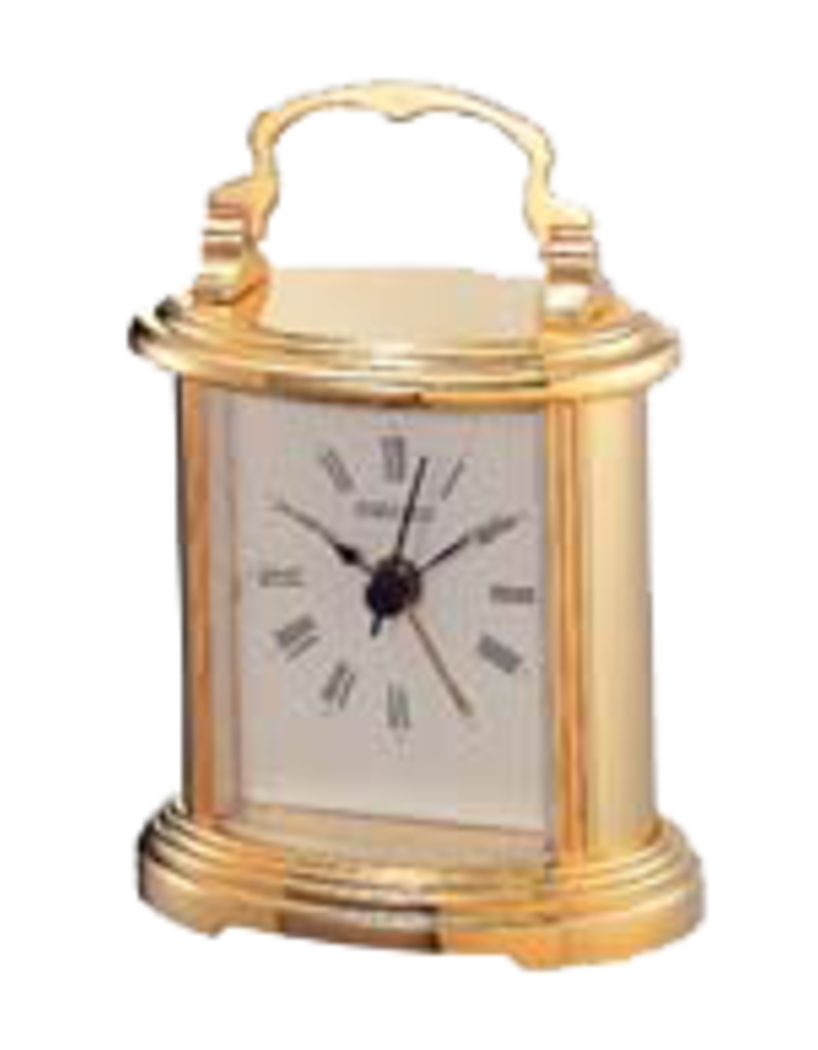 This Seiko Desk Table Clock is simple and elegant. This smaller profile carriage-style clock with a pivoting handle is a find. Plus, it has a beep alarm clock. It is substantial piece as it is made of alloy metal and is golden in color. Traditionally styled analog clock with features a white face with black Roman numerals. Powered by 1 AA battery (included). Overall dimensions: 4.3 X 3 X 2 inches. Fitted with precise quartz movement. Perfect for any table, mantel or shelf. Makes a great gift.