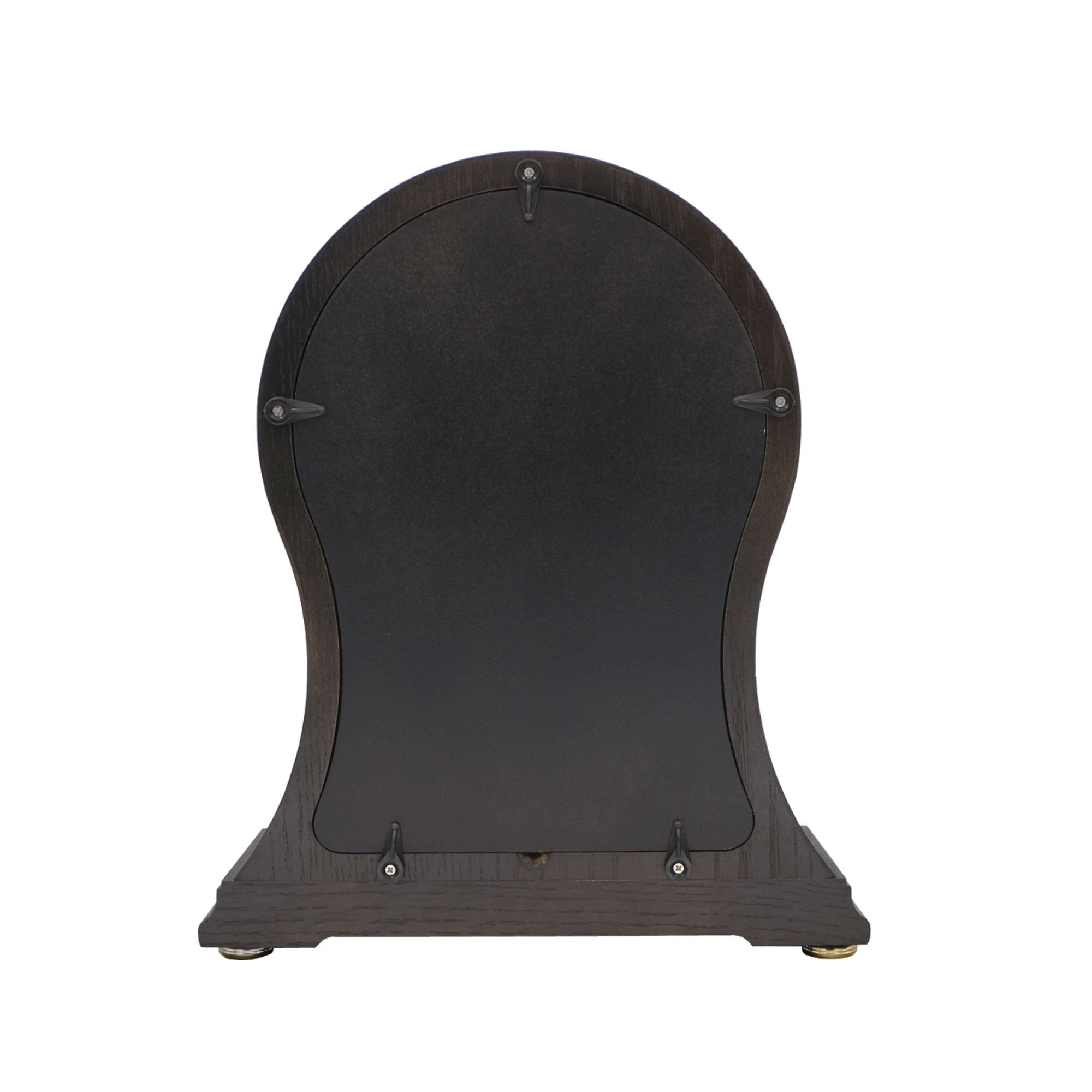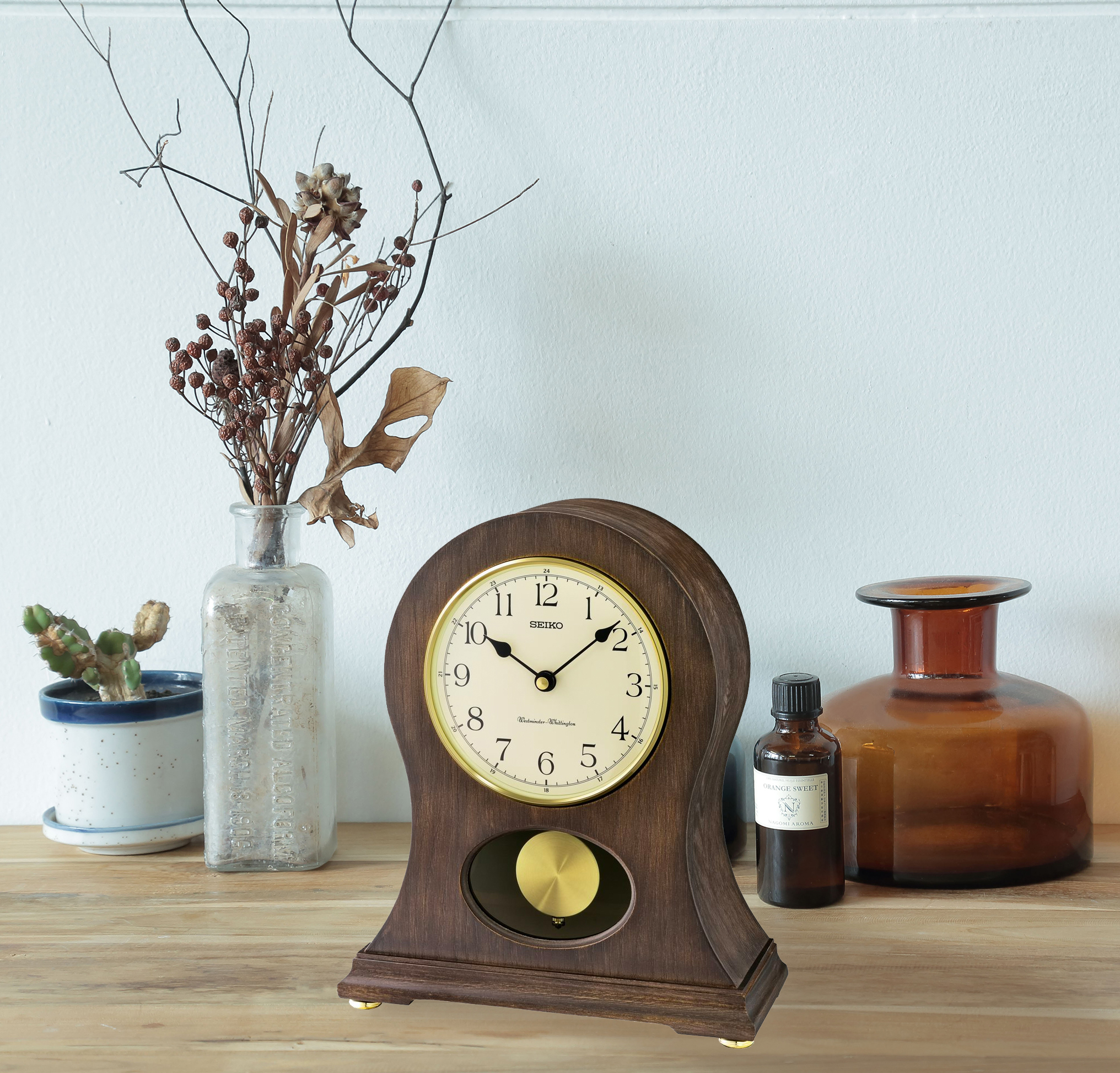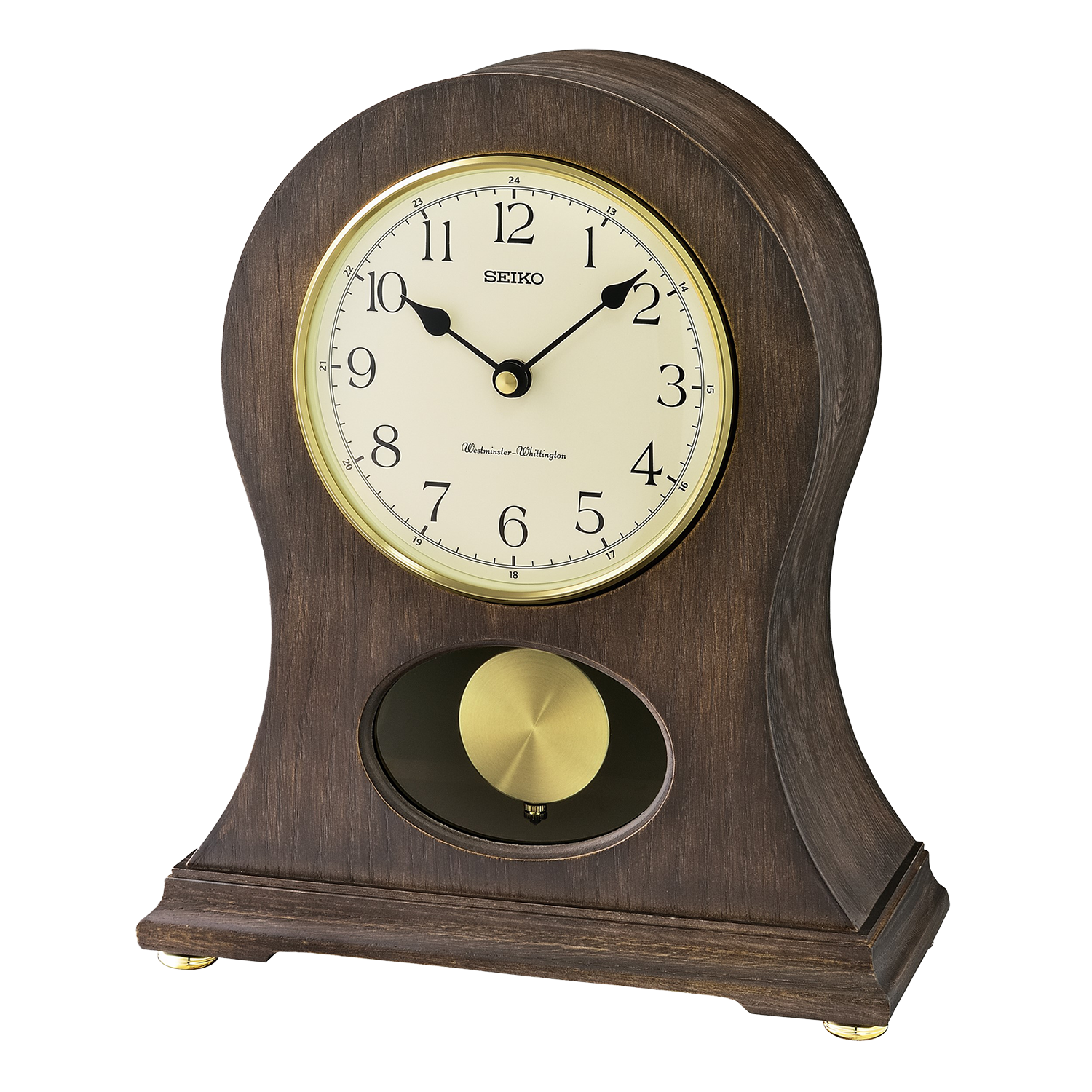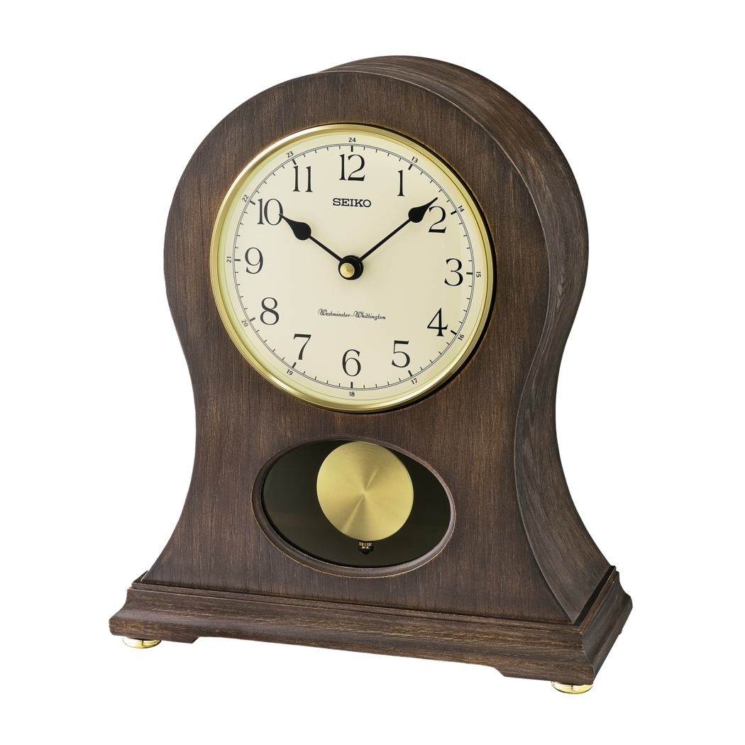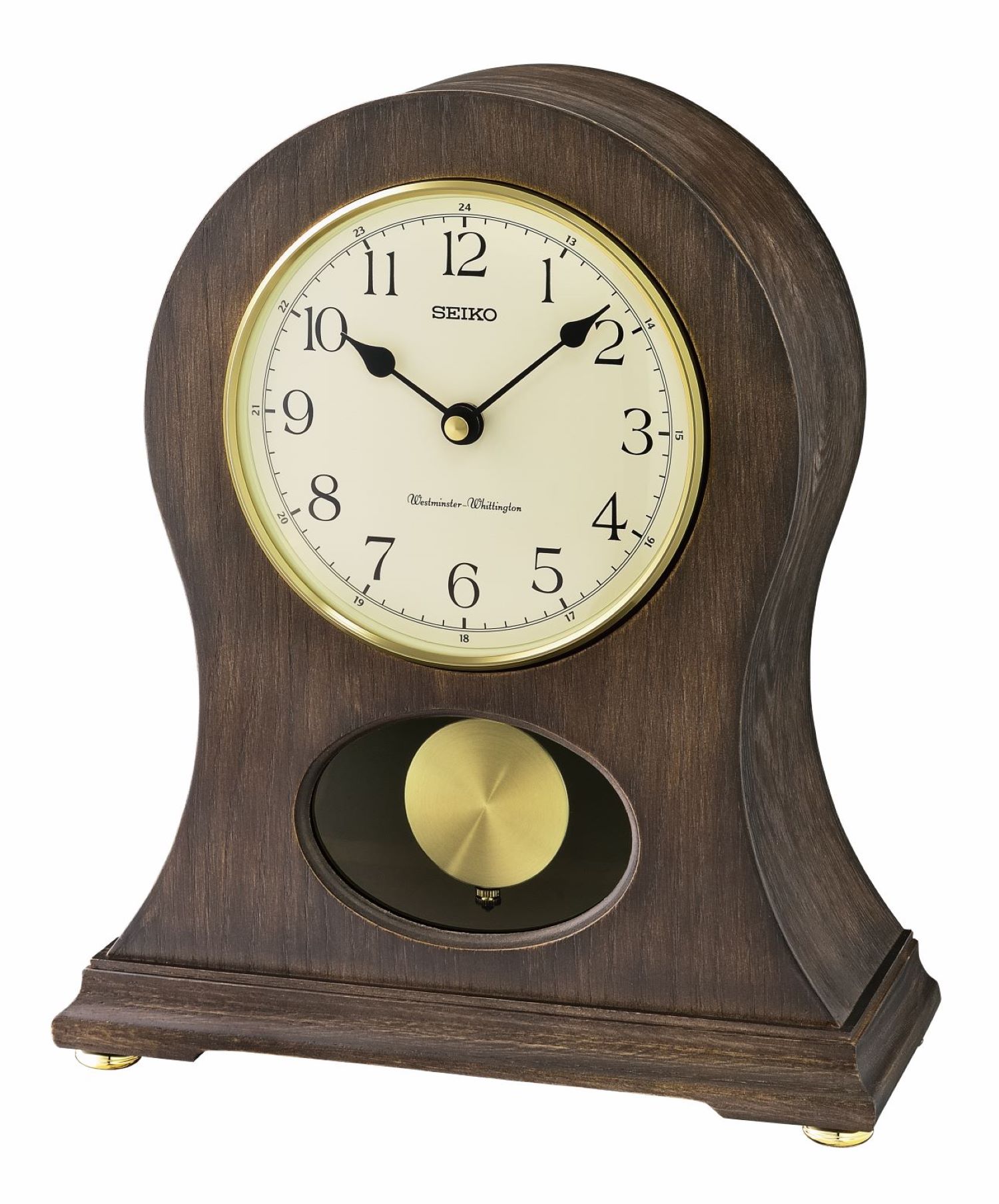 From its curved shape to its slightly distressed dark brown oak finish, the Seiko Mantel Clock is more than just a timepiece – it’s an artful addition to any mantel or table. With a precisely crafted wooden case, this clock features a glass cover and metal pendulum. Westminster/Whittington chimes play on the quarter-hour and create a charming complement to the hourly strikes, while a volume control and nighttime chime silencer complete the design. Overall dimensions: 12.2 X 10.2 X 4.7 inches.