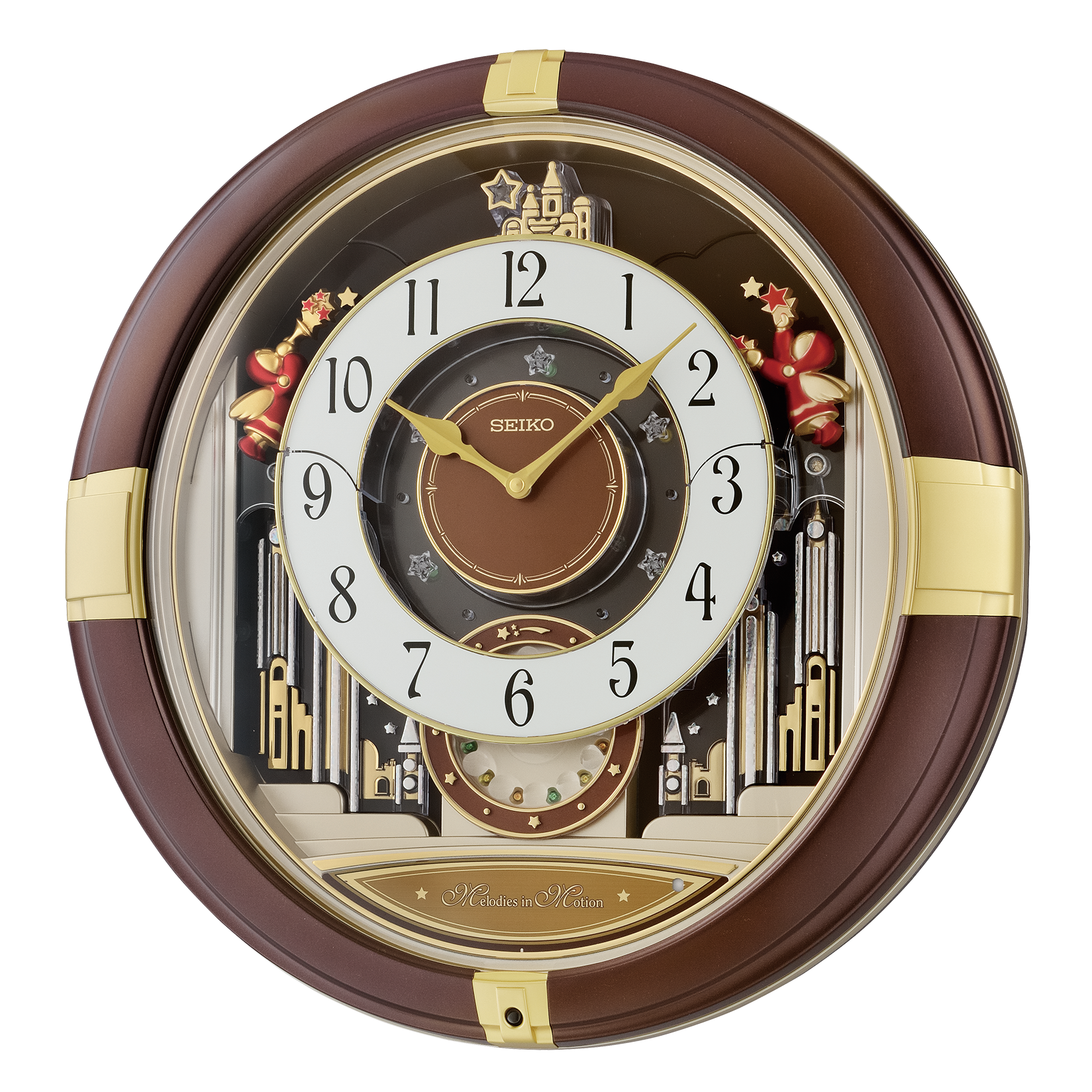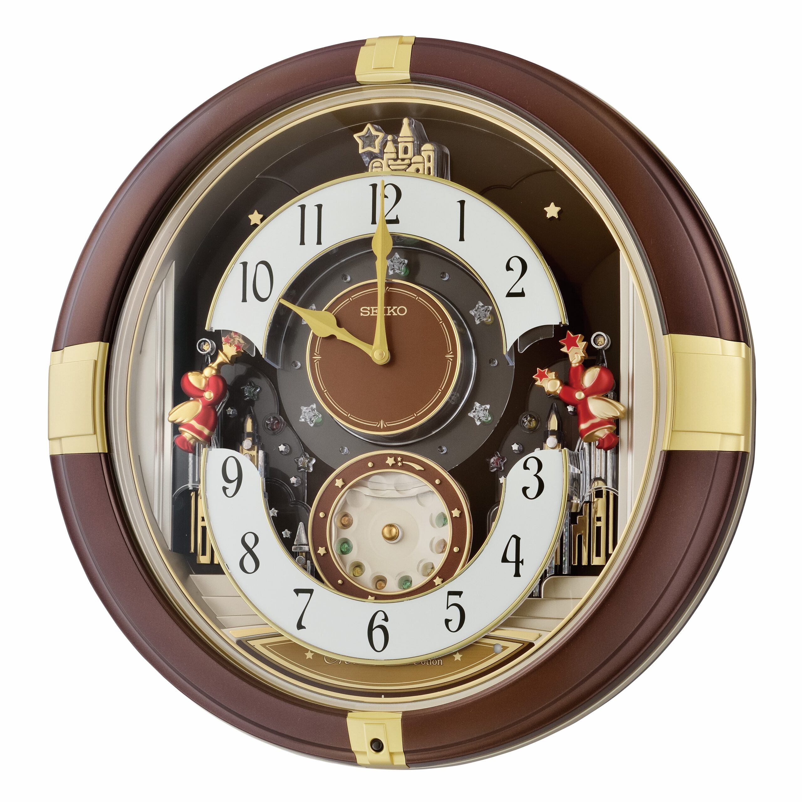 Seiko’s Melodies in Motion Clocks are enchanting and magical. This clock brings musical motifs to life. On the hour, the dial opens to reveal a turning decorative rotating pendulum and plays one of twelve of the finest quality sound melodies or Westminster chimes. It has a brown case with golden accents, twenty colorful sparkling LED lights with a light sensor, a demonstration button, and volume control. This clock is enclosed in glass and has an off/on switch. This clock will light up your house year-round. Powered by 4 D & 1 AA battery (included). Overall dimensions: 16.8 X 16.3 X 5.0 inches. Perfect for tween to adult.